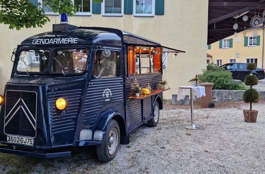 Notre Citroën Type H, transformée avec amour dans un charmant style rétro gendarmerie, est le stand de vente ou de distribution idéal.