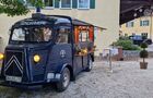 Location d'une Citroën HY de 1957, redessinée de façon unique et historique, transformée en food truck sans personnel ni service de restauration.